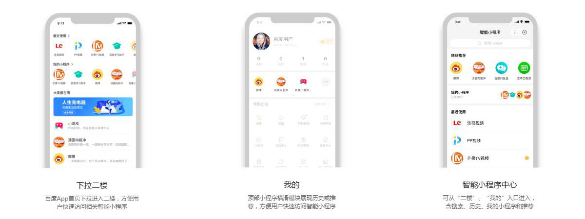 百度App首頁(yè)下拉進(jìn)入二樓,方便用戶(hù)快速訪問(wèn)相關(guān)智能小程序。頂部小程序橫滑模塊展現(xiàn)歷史或推薦,方便用戶(hù)快速訪問(wèn)智能小程序??蓮摹岸恰薄ⅰ拔业摹比肟谶M(jìn)入,含搜索、歷史、我的小程序和推薦。