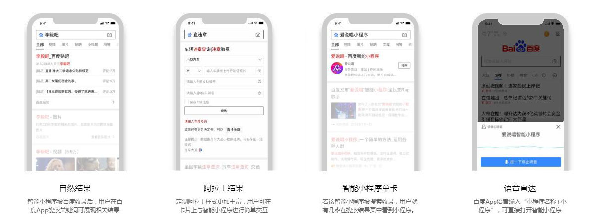 湖南魚(yú)竹科技旗下開(kāi)發(fā)的智能小程序被百度收錄后,用戶(hù)在百度App搜索關(guān)鍵詞可展現(xiàn)相關(guān)結(jié)果。定制阿拉丁樣式更加豐富,用戶(hù)可在卡片上與智能小程序進(jìn)行簡(jiǎn)單交互。若該智能小程序被搜索收錄,用戶(hù)就有幾率在搜索結(jié)果頁(yè)中看到小程序。百度App語(yǔ)音輸入“小程序名稱(chēng)+小程序”,可直接打開(kāi)智能小程序。